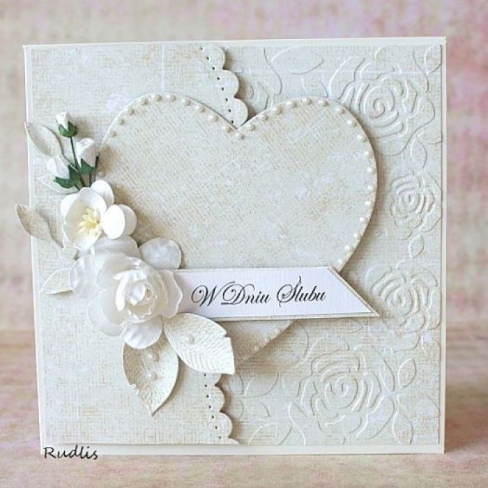 Delikatna i elegancka kartka z okazji ślubu. Wykonana ręcznie z wykorzystaniem profesjonalnych materiałów. Ozdobiona dużym przestrzennym sercem i pięknym bukietem kwiatów.