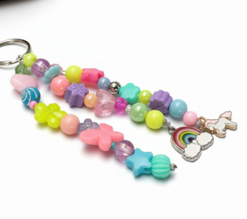 Breloczek w pastelowych kolorach z jednorożcem i tęczą.