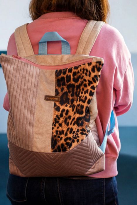 Duży, damski plecak miejski zapinany na suwak z kilku rodzajów kolorowych tkanin w połączeniu z welurem w panterkę.