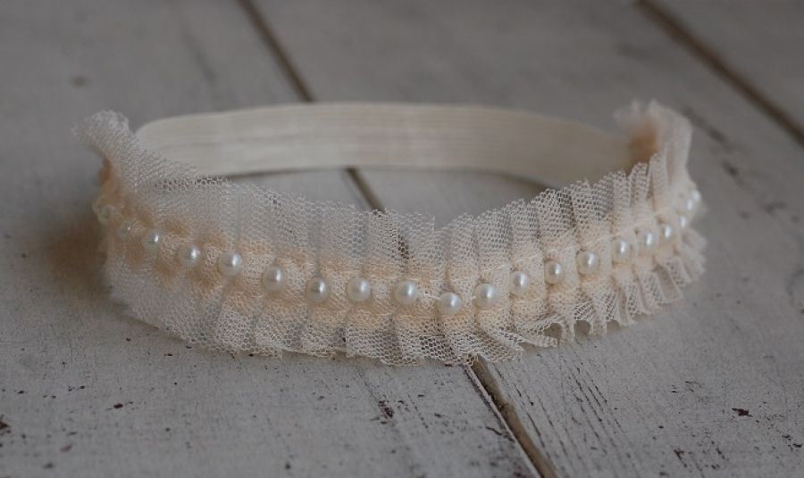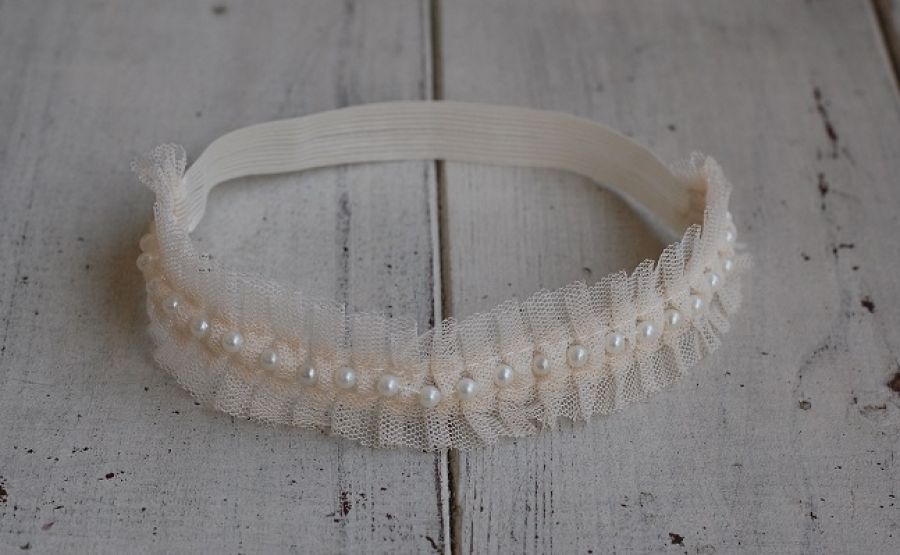 Opaska niemowlęca "Perełki & tiul" - opaska do włosów ozdobiona tiulem i perełkami. Opaska wykonana w połączeniu z gumką w kolorze złamanej bieli.