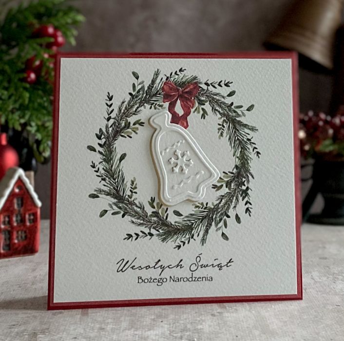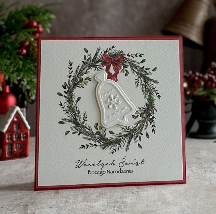 Elegancka i szykowna, ręcznie wykonana kartka bożonarodzeniowa z graficznym świątecznym wiankiem oraz ręcznie wyciętym dekorem.