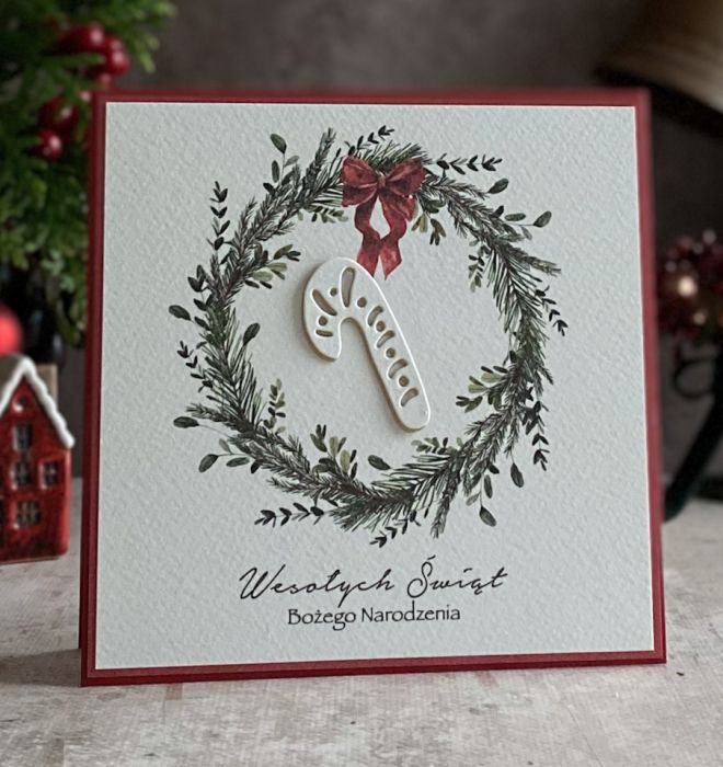 Elegancka i szykowna, ręcznie wykonana kartka bożonarodzeniowa z graficznym świątecznym wiankiem oraz ręcznie wyciętym dekorem.
