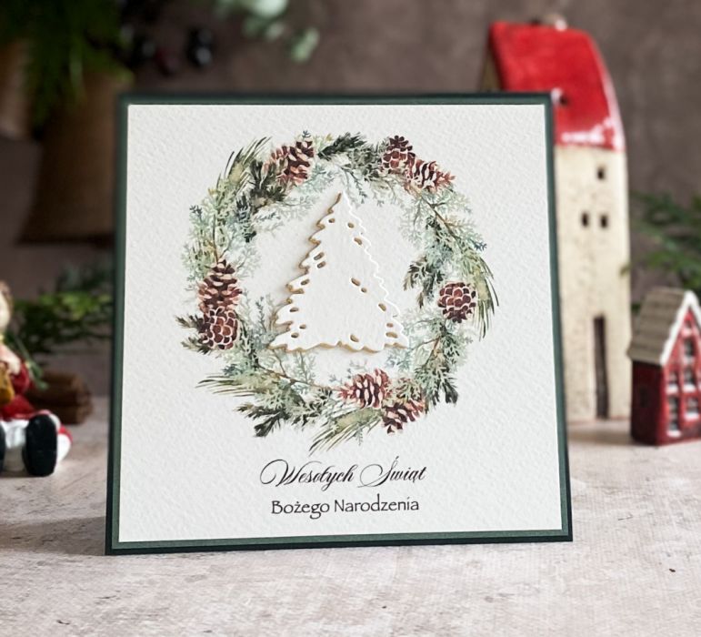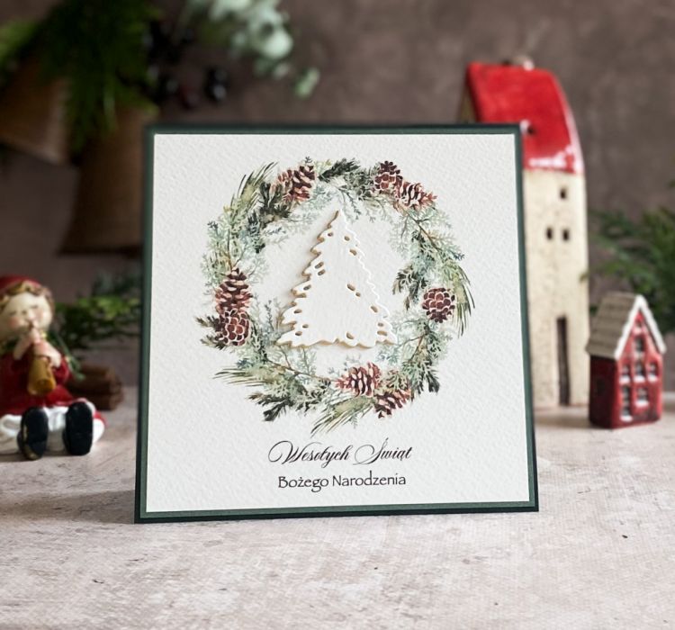 Elegancka i szykowna, ręcznie wykonana kartka bożonarodzeniowa z graficznym świątecznym wiankiem oraz ręcznie wyciętym dekorem.