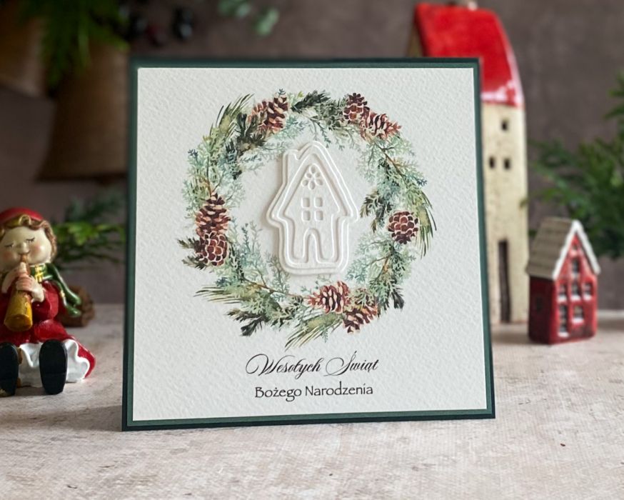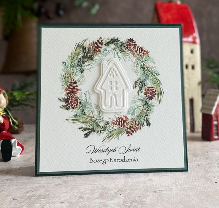Elegancka i szykowna, ręcznie wykonana kartka bożonarodzeniowa z graficznym świątecznym wiankiem oraz ręcznie wyciętym dekorem.