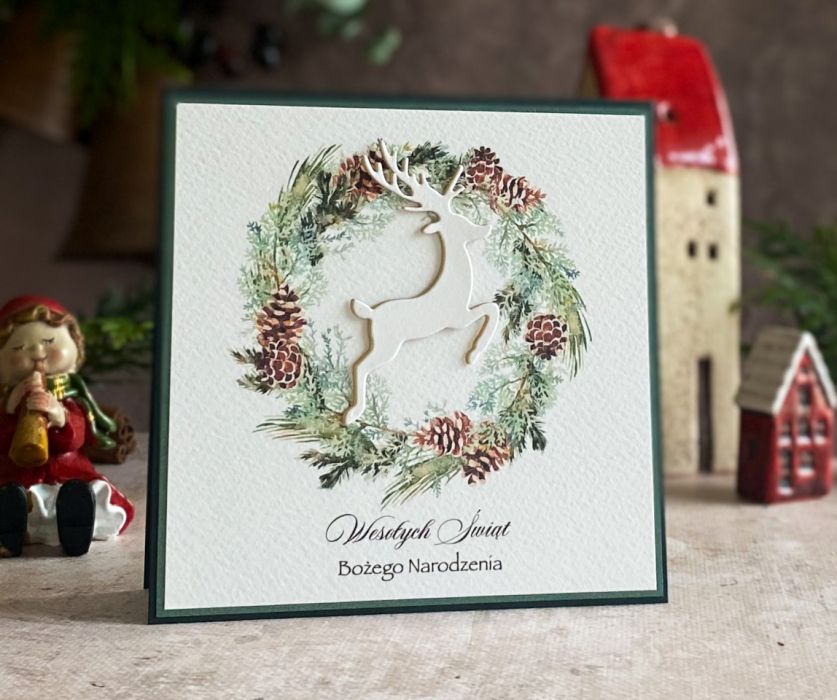 Elegancka i szykowna, ręcznie wykonana kartka bożonarodzeniowa z graficznym świątecznym wiankiem oraz ręcznie wyciętym dekorem.