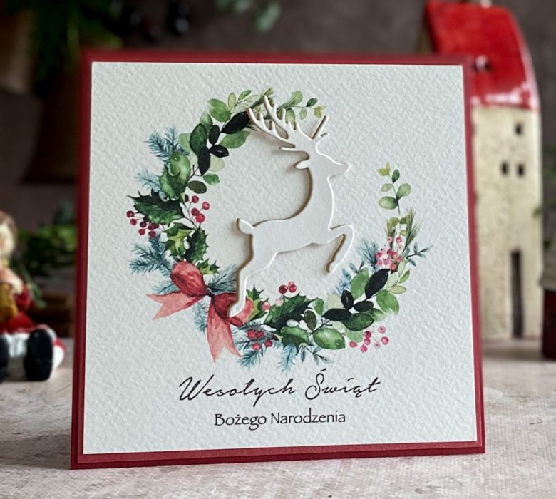 Elegancka i szykowna, ręcznie wykonana kartka bożonarodzeniowa z graficznym świątecznym wiankiem oraz ręcznie wyciętym dekorem.