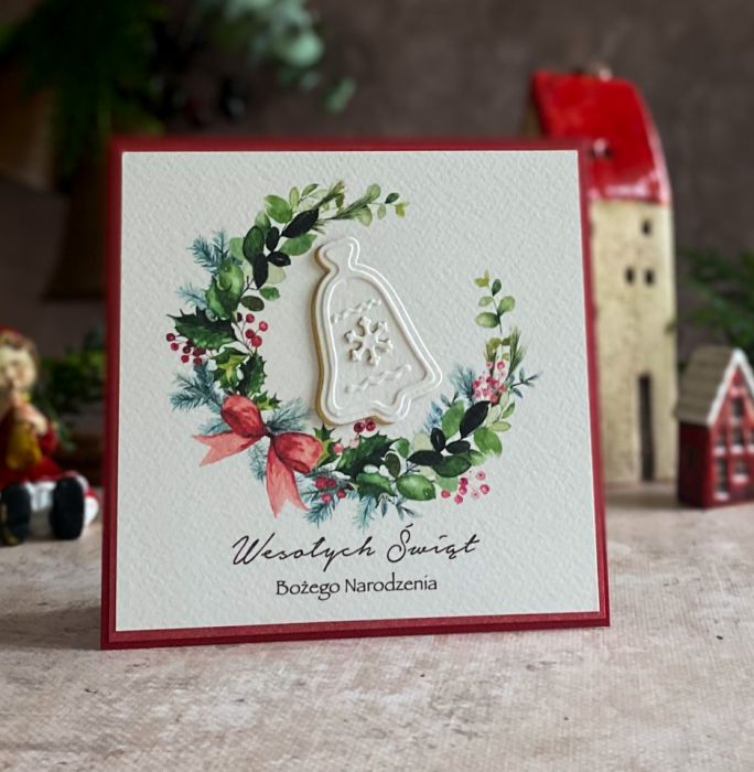 Elegancka i szykowna, ręcznie wykonana kartka bożonarodzeniowa z graficznym świątecznym wiankiem oraz ręcznie wyciętym dekorem.