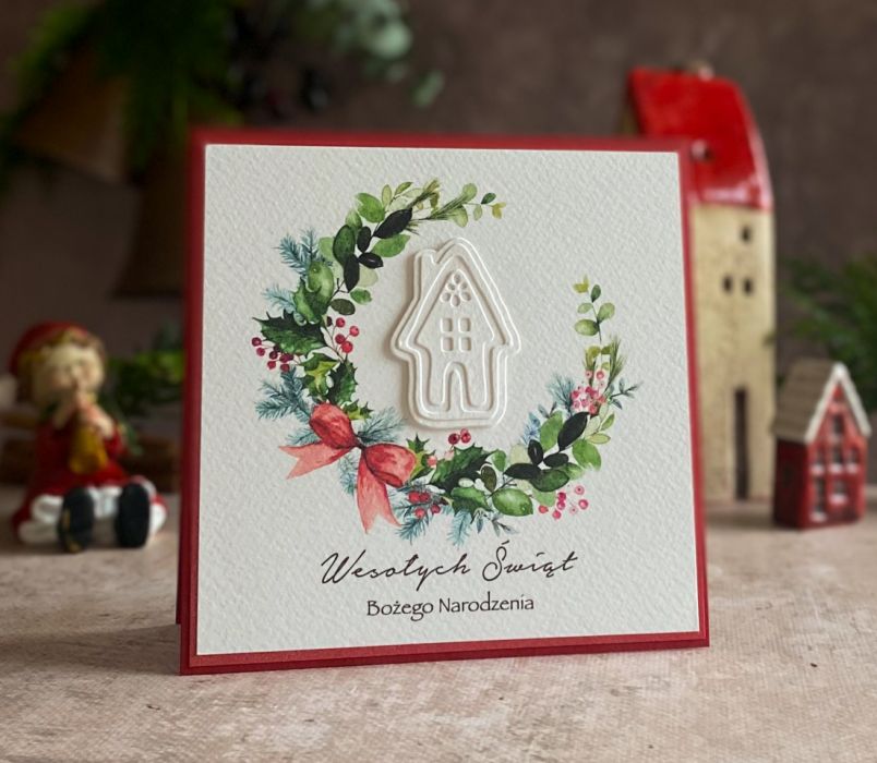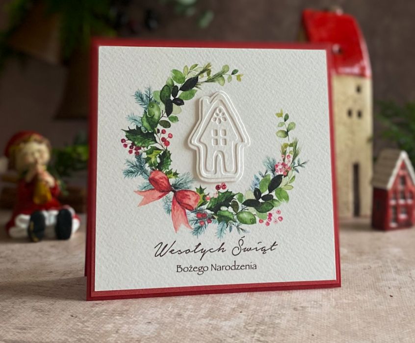 Elegancka i szykowna, ręcznie wykonana kartka bożonarodzeniowa z graficznym świątecznym wiankiem oraz ręcznie wyciętym dekorem.