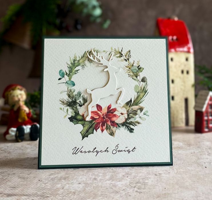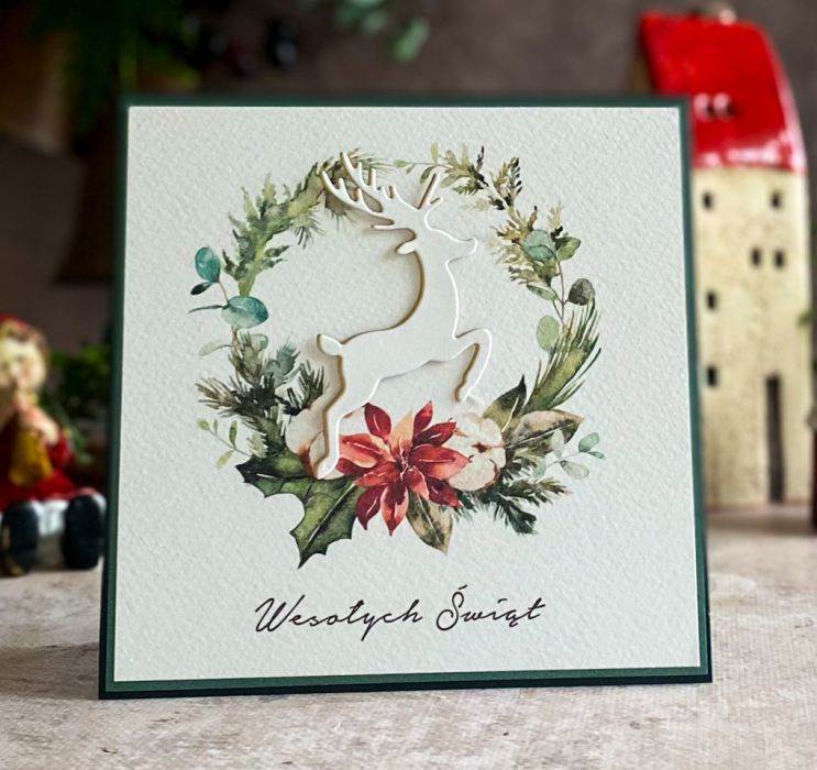 Elegancka i szykowna, ręcznie wykonana kartka bożonarodzeniowa z graficznym świątecznym wiankiem oraz ręcznie wyciętym dekorem.