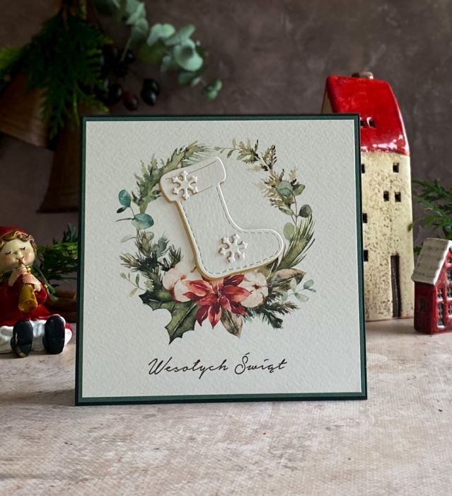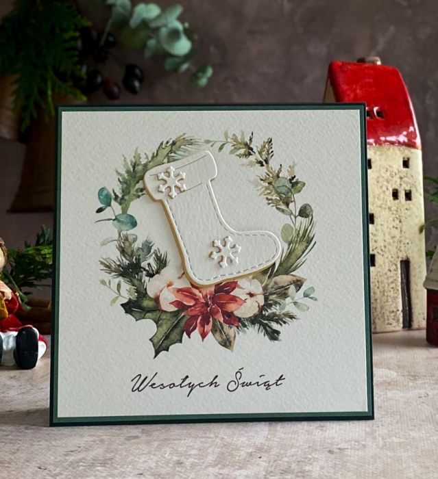 Elegancka i szykowna, ręcznie wykonana kartka bożonarodzeniowa z graficznym świątecznym wiankiem oraz ręcznie wyciętym dekorem.