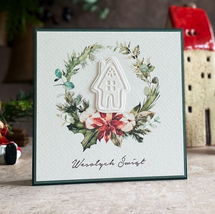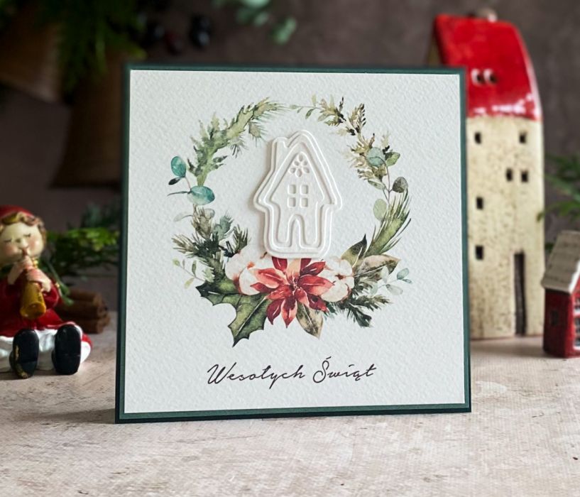 Elegancka i szykowna, ręcznie wykonana kartka bożonarodzeniowa z graficznym świątecznym wiankiem oraz ręcznie wyciętym dekorem.
