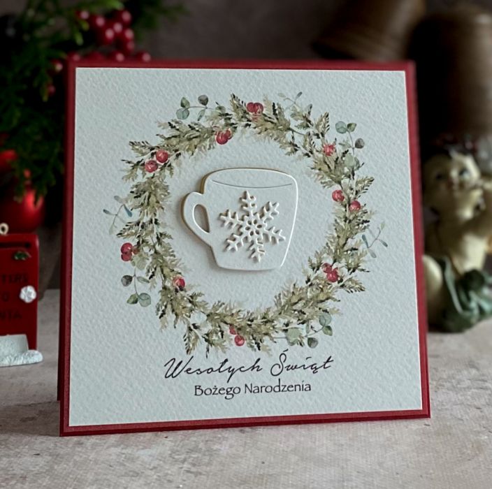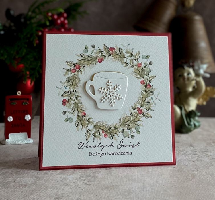 Elegancka i szykowna, ręcznie wykonana kartka bożonarodzeniowa z graficznym świątecznym wiankiem oraz ręcznie wyciętym dekorem.