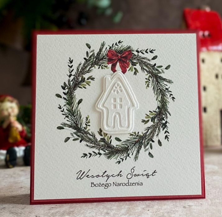 Elegancka i szykowna, ręcznie wykonana kartka bożonarodzeniowa z graficznym świątecznym wiankiem oraz ręcznie wyciętym dekorem.