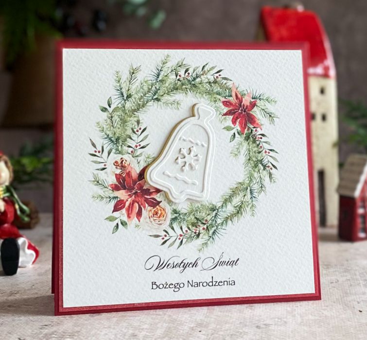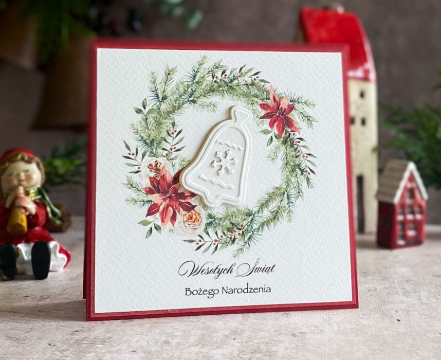 Elegancka i szykowna, ręcznie wykonana kartka bożonarodzeniowa z graficznym świątecznym wiankiem oraz ręcznie wyciętym dekorem.