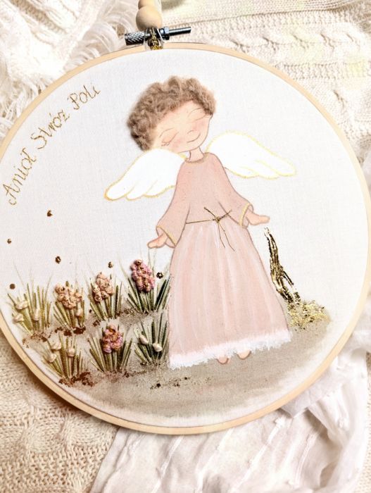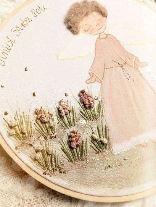 Anioł został namalowany farbami akwarelowymi na płótnie bawełnianym.