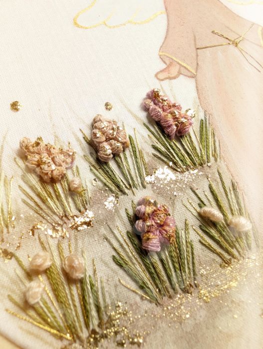 Kwiaty są ręcznie wyszywane, dodatkowo ozdobione mieniącym się złotkiem.