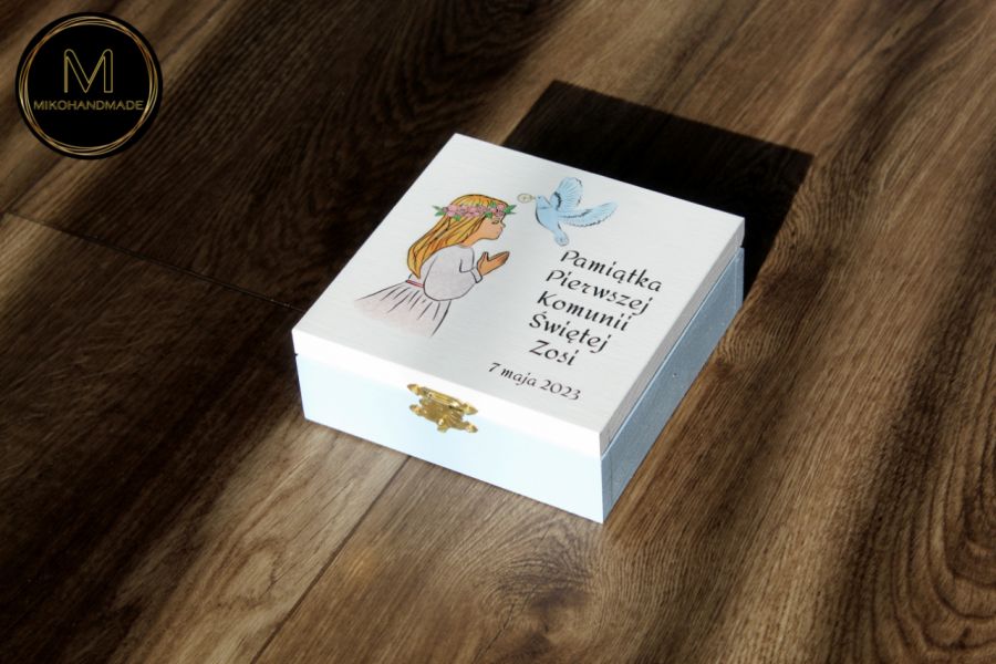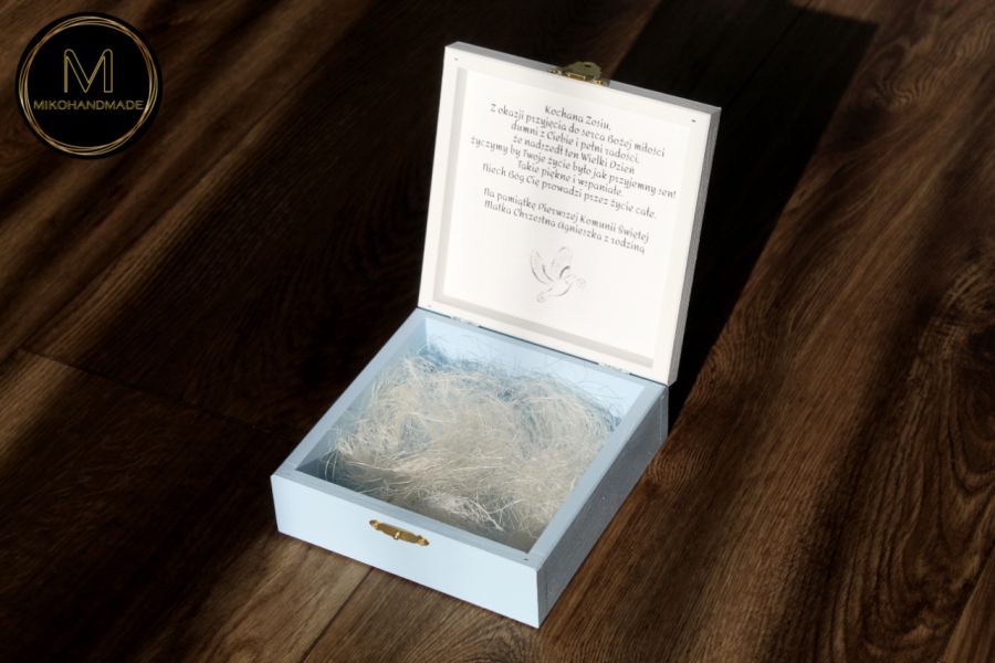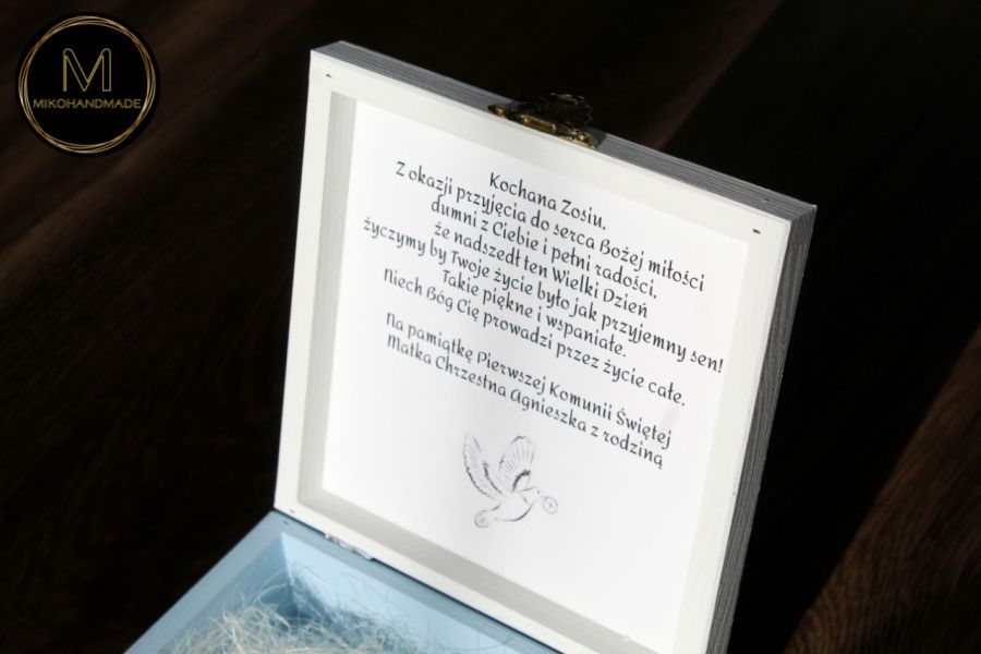Pudełko zostało wykonane z drewna i pomalowane ręcznie w delikatnej, biało-błękitnej kolorystyce, która kojarzy się z czystością i spokojem. Centralnym punktem wieka jest uroczy wzór dziewczynki komunijnej, utrzymany w stylistyce idealnie pasującej do rangi wydarzenia. Na wieku znajduje się również osobista dedykacja zawierająca imię dziecka oraz datę Pierwszej Komunii Świętej, co czyni je prezentem "szytym na miarę".