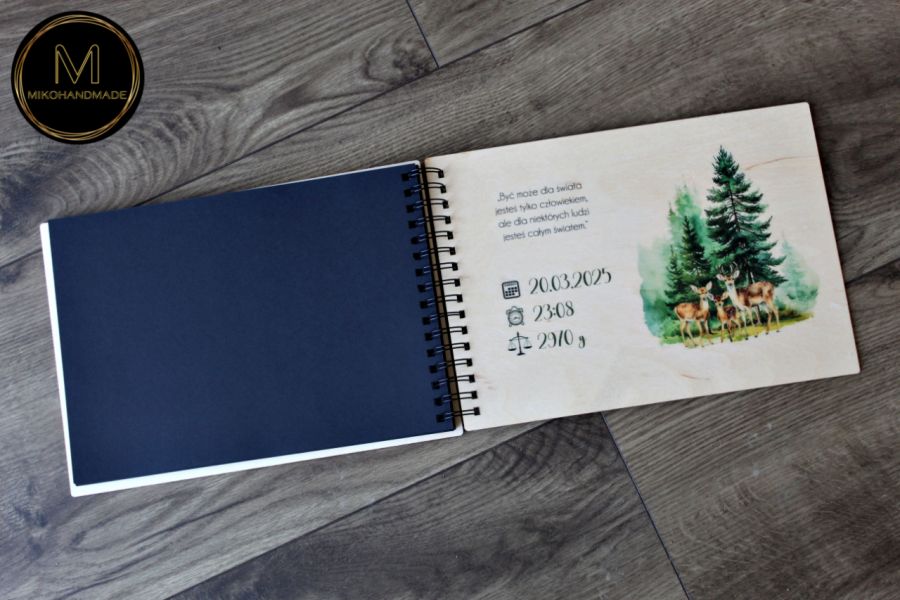 Uchwyć najcenniejsze chwile w tym wyjątkowym, ręcznie wykonanym albumie, który stanie się rodzinną skarbnicą wspomnień. Idealny na prezent z okazji narodzin, chrztu, pierwszych urodzin (roczek), lub jako niepowtarzalna pamiątka do pokoiku dziecięcego w stylu leśnym.
