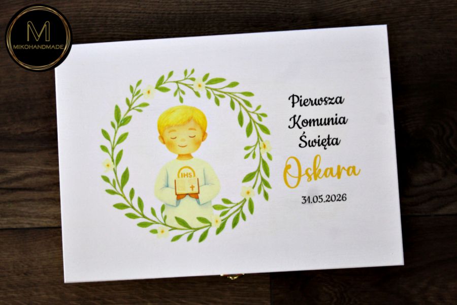 Szukasz wyjątkowego, pamiątkowego prezentu z okazji Pierwszej Komunii Świętej? Ta elegancka, w pełni personalizowana drewniana skrzynka to połączenie funkcji, piękna i głębokiego przesłania. Wykonana z dbałością o każdy detal, stanie się cenioną pamiątką na całe życie.
