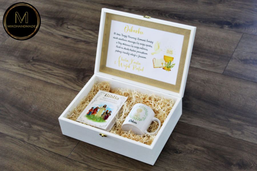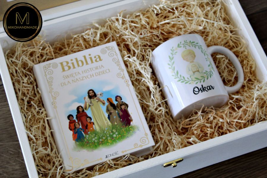 ✔ Praktyczny – kubek i Biblia to rzeczy użytkowe, a skrzynka służy jako piękne pudełko na pamiątki.