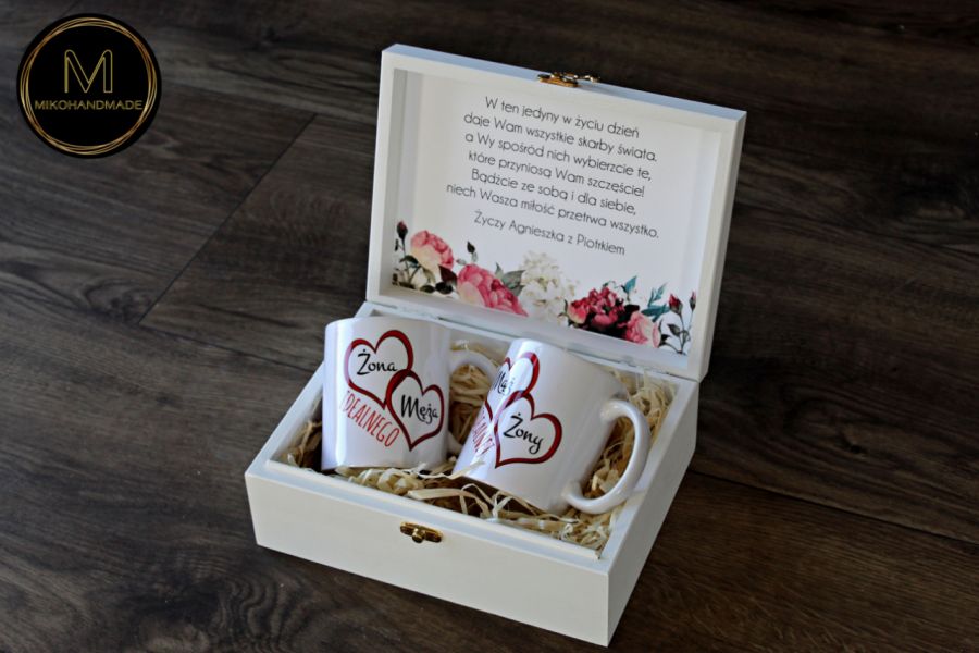 Kubki zapakowane są w solidne, drewniane pudełko o wymiarach 24x18x9 cm, pomalowane na matowy, biały kolor. Wieko pudełka zdobi ręcznie naniesiony wzór romantycznych kwiatów w odcieniach czerwieni i bordo, który nadaje całości niezwykłej elegancji i artystycznego wyrazu.