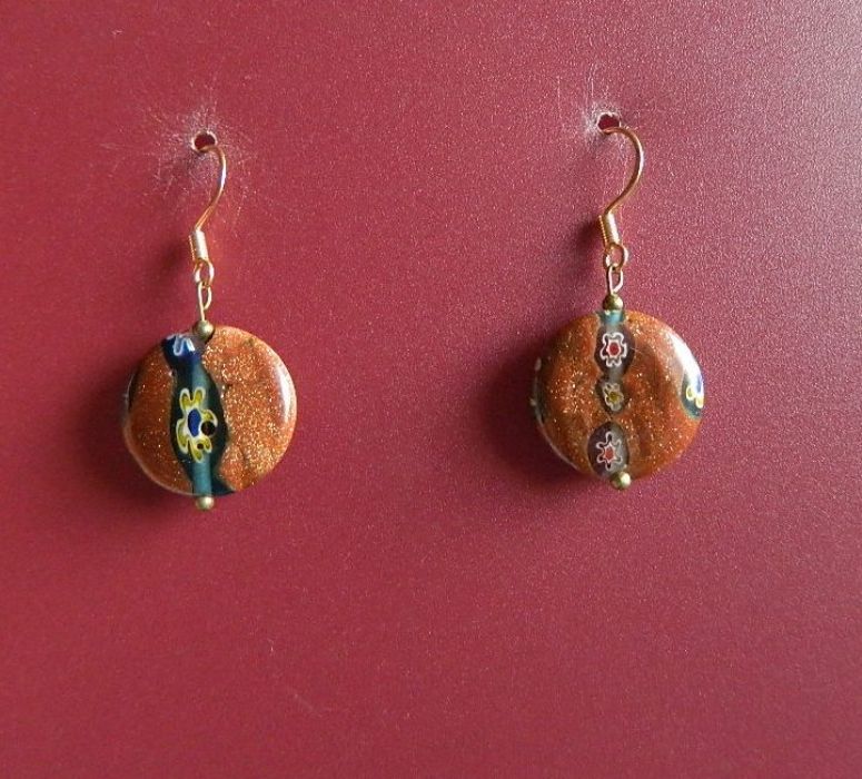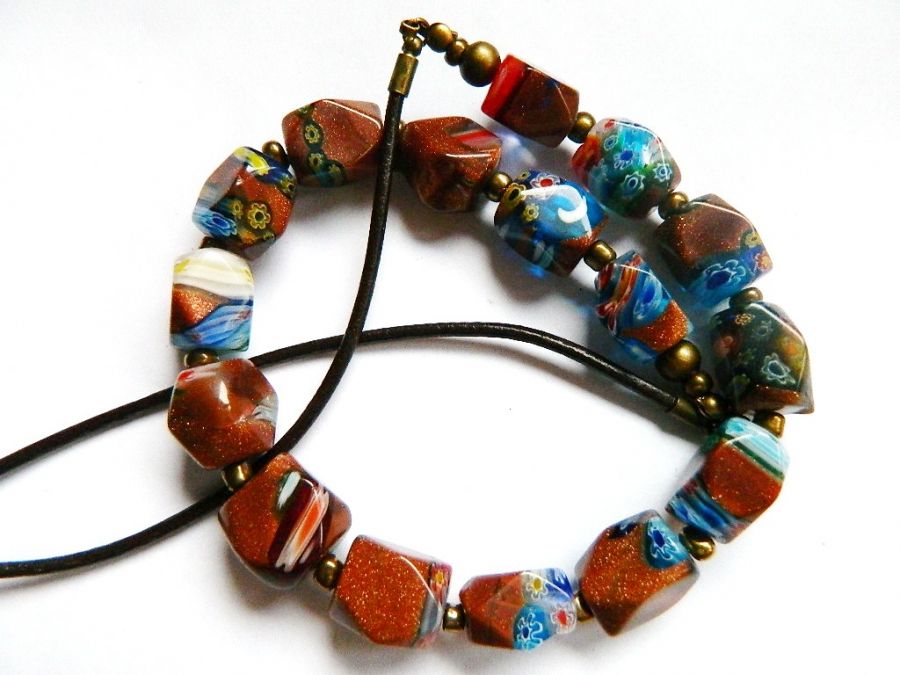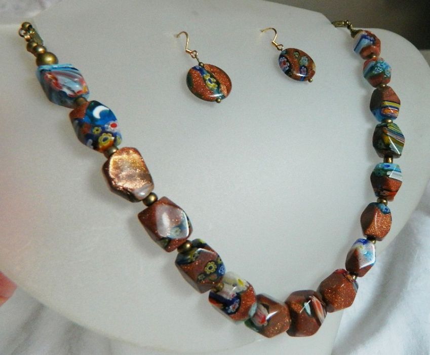 Oryginalny zestaw wykonany z unikatowych kamieni. W złocistym kamieniu zwanym Piasek Pustyni zatopione kolorowe fragmenty szkła weneckiego o nazwie Millefiori.