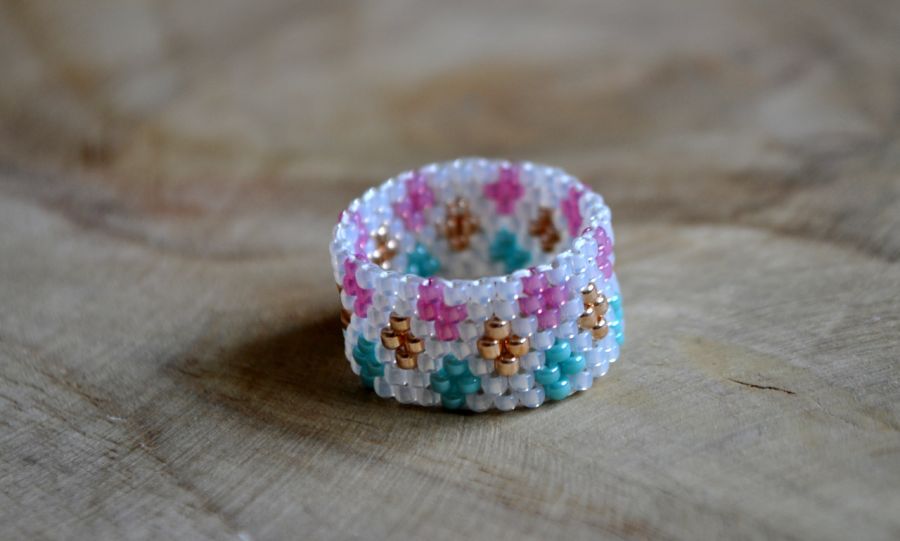 Pierścionek-obrączka wykonany jest z drobnych szklanych koralików Toho: białych, różowych, turkusowych i złotych, wzór układa się w romby. Jest wygodny, dopasowuje się do palca.