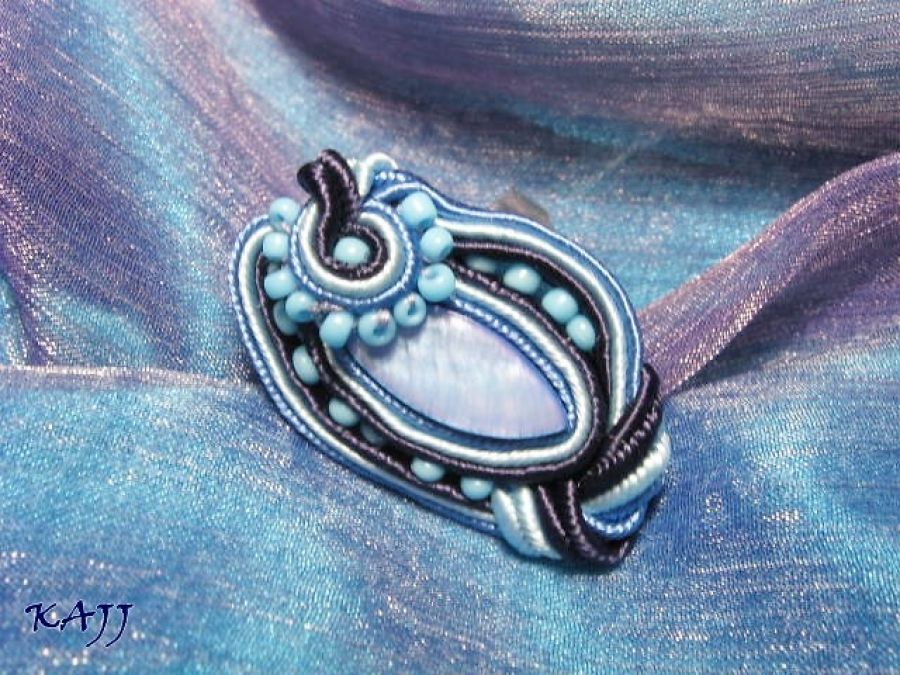 Oryginalny pierścionek, którego oczko zostało wykonane techniką haftu sutaszowego. Centrum oczka stanowi listek z niebieskiej masy perłowej. Obrączka jest posrebrzana o regulowanym obwodzie, dopasuje się do każdego palca. Wymiary oczka: 3,3 cm na 2,2 cm, wysokość oczka ok 5 mm.