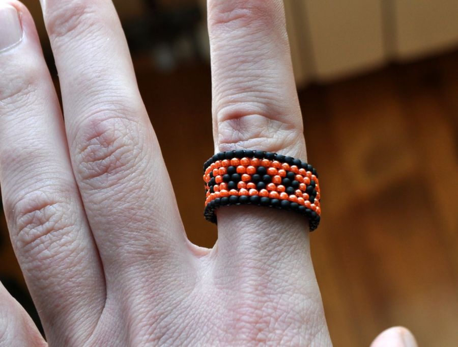 Pierścionek-obrączka wykonany jest z drobnych szklanych koralików Toho pomarańczowych z połyskiem i czarnych matowych, wzór w romby. Nosi się go wygodnie, dopasowuje się do palca i jest ciekawym dodatkiem. Zapraszam.