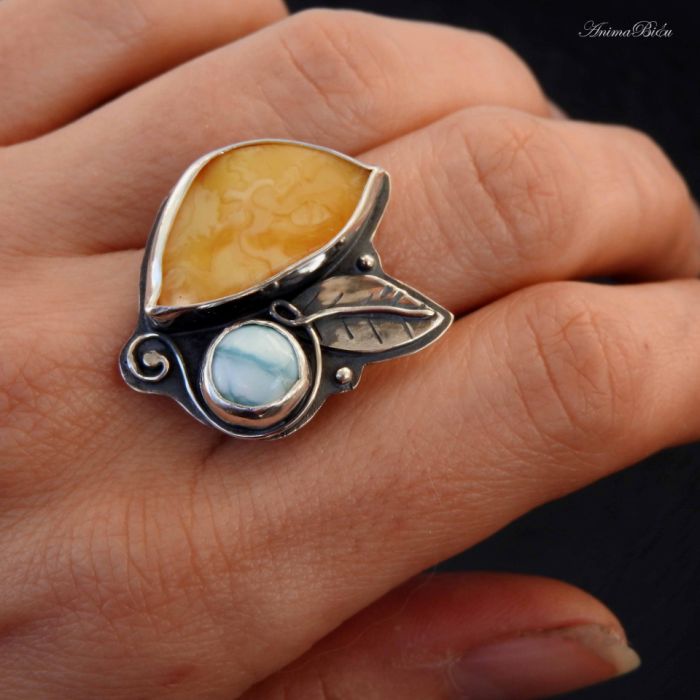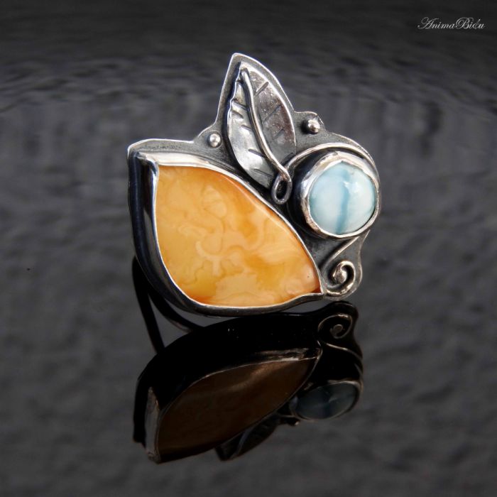 Pierścionek srebrny z bursztynem bałtyckim i larimarem. Fantastyczne połączenie miodowego bursztynu bałtyckiego z karaibskim błękitem larimaru. Oba kamienie zachwycają urodą, każdy ma na swej powierzchni wspaniałe wzory stworzone przez samą naturę. Larimar przypomina spienione, błękitno białe morze, a bursztyn kusi apetycznymi mleczno żółtymi i miodowymi odcieniami. Korona jest wyrazista, pięknie prezentuje się na dłoni, ozdobiłam ją srebrnym, rzeźbionym listkiem, kuleczkami i zawijasem. Całość wykonałam na srebrze próby 925 i 999, które przyciemniłam i wypolerowałam. Wymiary korony to 30 na 25 milimetrów. Osadziłam ja na podwójnej, regulowanej obrączce. Przy zakupie proszę o informację jaki rozmiar mam ustawić. Waga: 7,7 gramów, w tym srebro 6,3 g. Technika wykonania: lutowanie, młotkowanie. Cechowany w Urzędzie Probierczym.