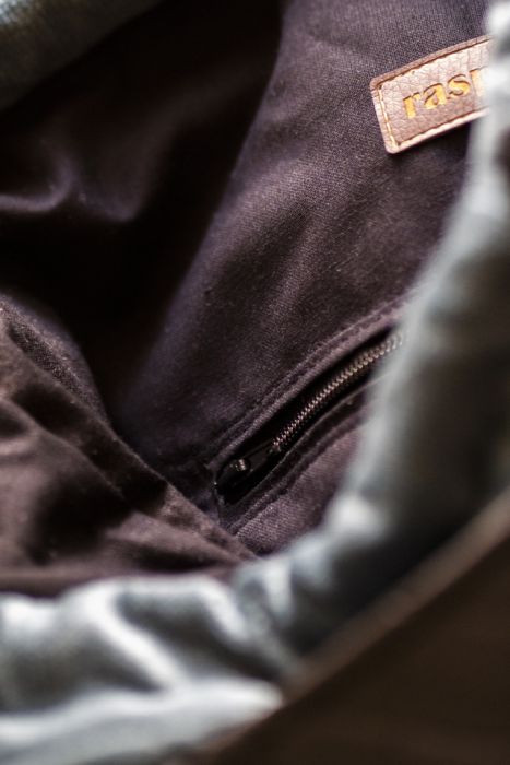 Ściągana jest jak worek bawełnianym sznurkiem w kolorze czarnym. Dół daje dodatkowe miejsce na przechowywanie rzeczy - z przodu dwie mniejsze, z tyłu torby jedna duża kieszeń.