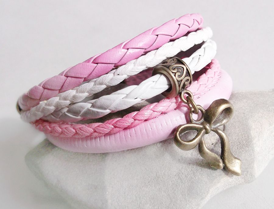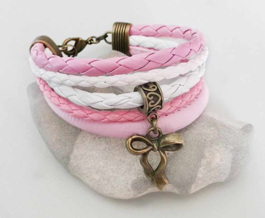Bransoletka w bardzo ładnych odcieniach różu i bieli. Oprawa w kolorze antycznego brązu. Zawieszka -piękna kokardka. Na nadgarstek 15-18 cm. Rzemyki bardzo miękkie i miłe, syntetyczne.