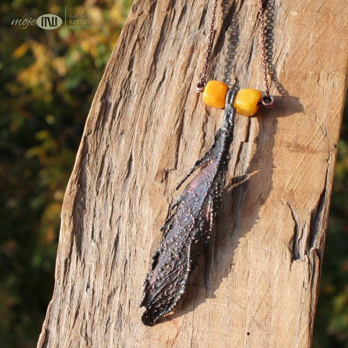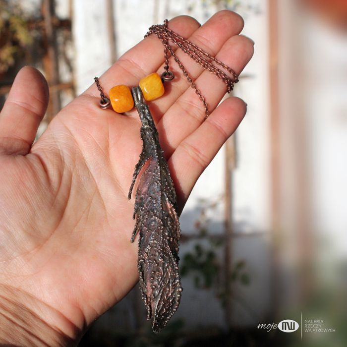 Ptasie pióro (prawdziwe) pokryte warstewką miedzi w długotrwałej technice elektroformowania. Miedź pokryta jest cyną, patynowana i przetarta dla wydobycia nieregularnej faktury. Fasetowane kostki marmuru w kolorze dojrzałego banana dodają koloru. Zawieszony na łańcuszku w kolorze grafitowym.