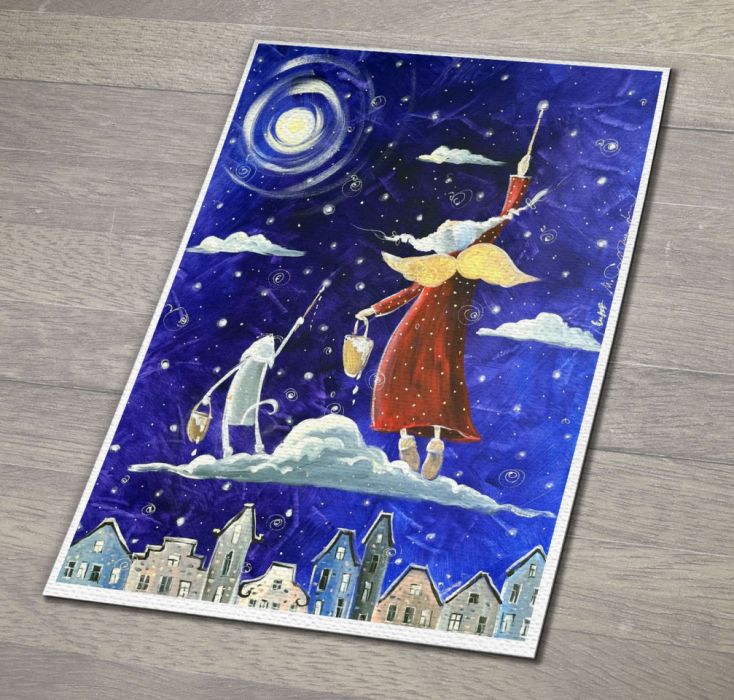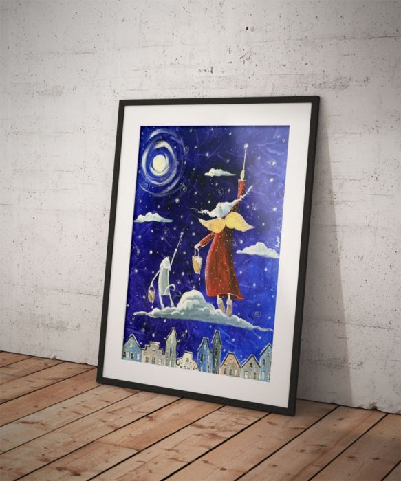 Reprodukcja pracy własnej zatytułowanej "Magiczne gwiazdki marzeń". Wydrukowana na wysokiej jakości satynowanym papierze o gramaturze 200-220 g/m² o wymiarze 29,7 x 42 cm (format A3), w technologii druku pigmentowego. Technologia ta zapewnia doskonałe odwzorowanie kolorów oraz trwałość i odporność na promieniowanie UV. Obraz bez oprawy.