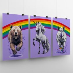 Unikalny tryptyk przedstawiający nosorożca, jednorożca i niedźwiedzia, które uważane są za jedne z ikonicznych symboli osób ze społeczności LGBTQA+. Nosorożec to symbol walki z prześladowaniem osób queer. Jednorożec od dawna uważany jest za symbol takich osób. Niedźwiedź nawiązuje do dojrzałych i mocno zbudowanych mężczyzn, którzy gustują w partnerach podobnych do nich. Tryptyk to przy plakaty w rozmiarze 60x84 cm, na papierze pół-mat, 220 g/m2, bez ramy. Dla uzyskania najlepszego efektu tęczy plakaty należy powiesić mniej więcej 4 cm od siebie. Moje plakaty drukowane są w małej drukarni, która bardzo dba o jakość ostatecznego produktu. Jako że prowadzę jednoosobową działalność, składam zamówienia na druk dwa razy w miesiącu. Plakaty wysyłam w bezpiecznych kartonowych tubach.