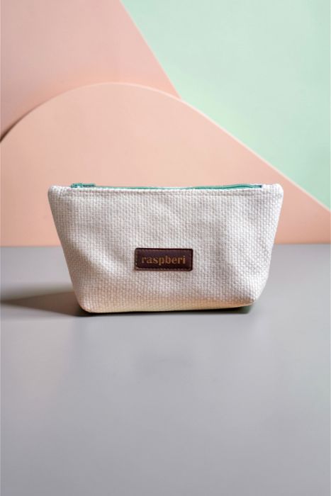 Średniej wielkości kosmetyczka wykonana z jasnej plecionki.
