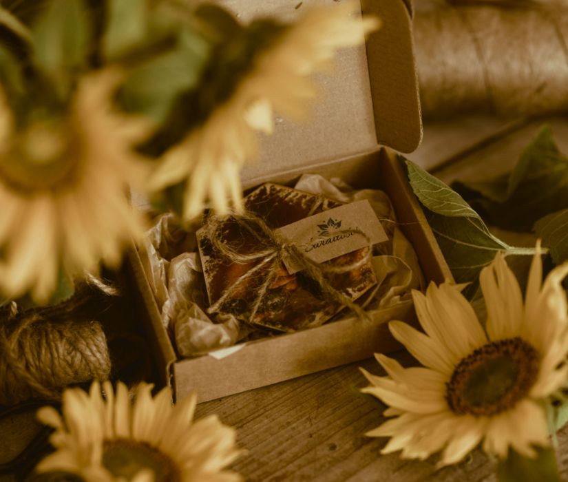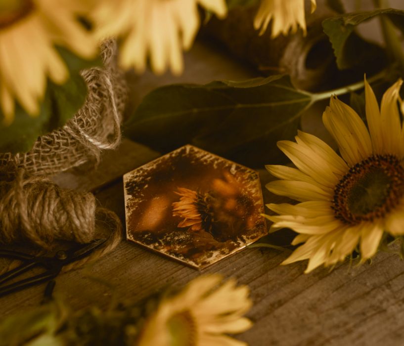 Drewniana podkładka pod kubek w stylu retro i vintage z kwiatem słonecznika.