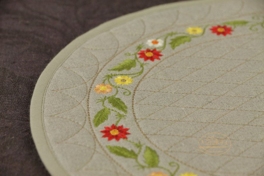 Ozdobione są kwiatowym haftem autorskim, przepikowane, obszyte bawełnianą lamówką w kolorze zbliżonym do naturalnego lnu.