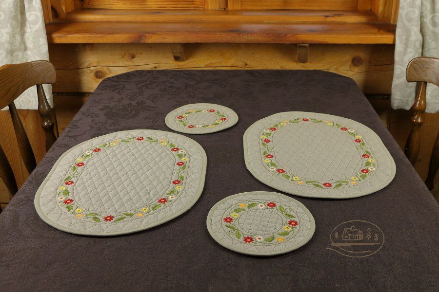 Podkładki pod talerze uszyte są przeze mnie z tkaniny lnianej w kolorze naturalnym (warstwa wierzchnia i spodnia).