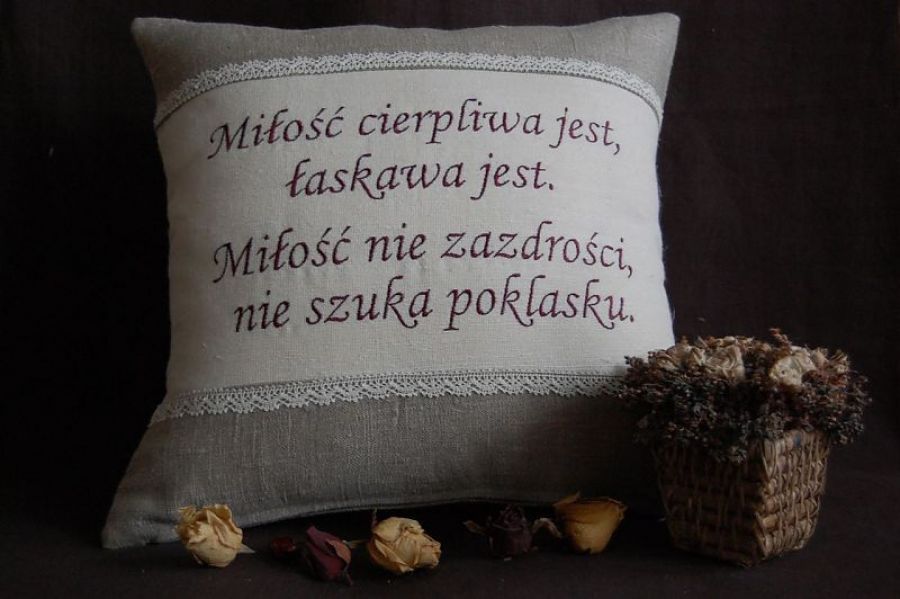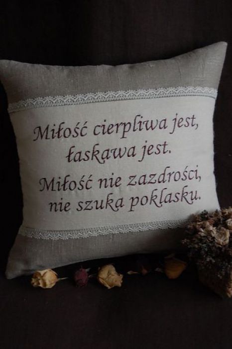 "Rustykalna miłość" - poszewka na poduszkę wykonane z grubego, surowego lnu. Na przodzie wstawka z surówki bawełnianej w kolorze ecri z wyhaftowanym cytatem o miłości - jednym z najpiękniejszych z "1Listu do Koryntian". Wstawka z cytatem z dołu i góry obszyta bawełnianą koronką. Zapinane na dole na zamek błyskawiczny. Wymiary: około 40cm x 40cm. Oferta obejmuje same poszewki, bez wypełnienia. Poszewki można prać w temperaturze 40'.