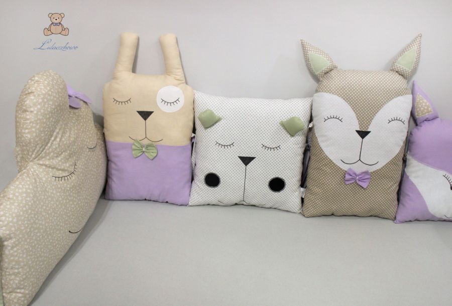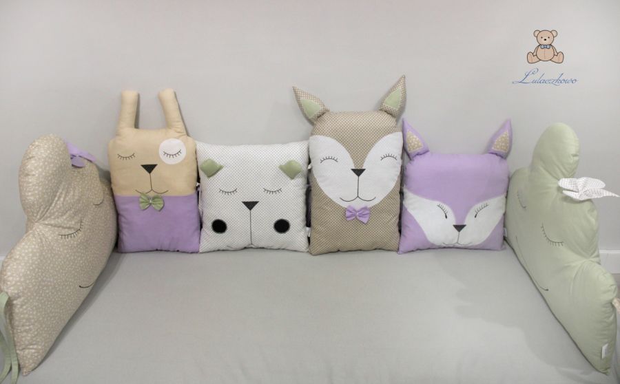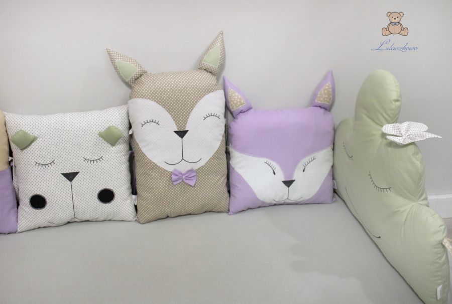 Poduszka ozdobna dziecięca w kształcie króliczka, moduł do ochraniacza modułowego do łóżeczka dziecięcego. Dostępna w wielu wariantach kolorystycznych. Oferta dotyczy pojedynczej sztuki z troczkami do wiązania bądź bez. Podusia uszyta jest z 100% bawełny i wypełniona antyalergiczną kulką silikonową. Oczka i nosek malowane wodoodpornym markerem do tkanin. Może być zarówno śliczną ozdobą dziecięcego pokoju, ochroną dla dziecka, jak również przytulanką.
