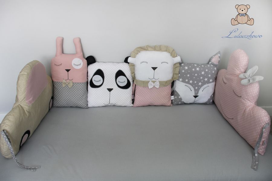 Poduszka ozdobna, dziecięca w kształcie misia pandy, moduł do ochraniacza modułowego do łóżeczka dziecięcego. Dostępna w wielu wariantach kolorystycznych. Oferta dotyczy pojedynczej sztuki z troczkami do wiązania bądź bez. Podusia uszyta jest z 100% bawełny i wypełniona antyalergiczną kulką silikonową. Oczka i nosek malowane wodoodpornym markerem do tkanin. Może być zarówno śliczną ozdobą dziecięcego pokoju, ochroną dla dziecka, jak również przytulanką.