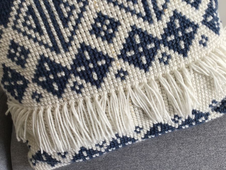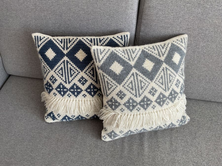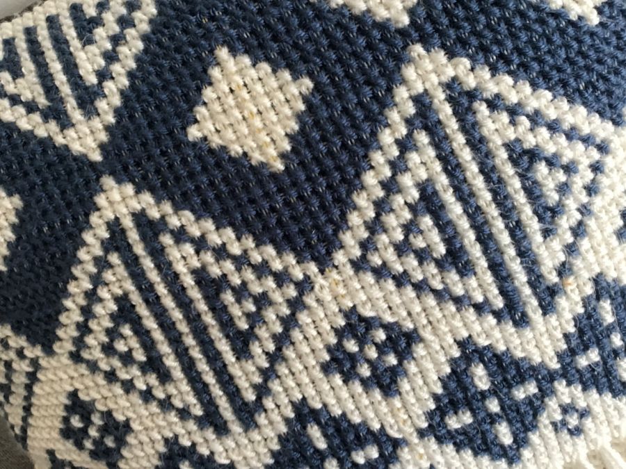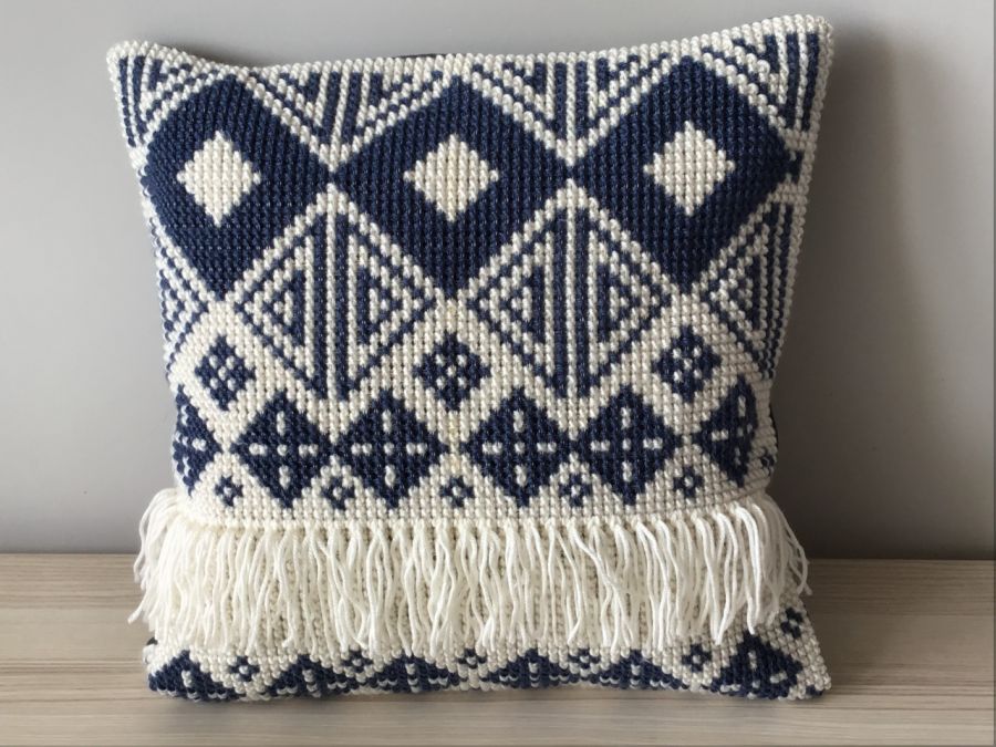 Poduszka o wymiarach 40 x 40 cm wyszyta krzyżykami na kanwie poduszkowej delikatną wełną akrylową.