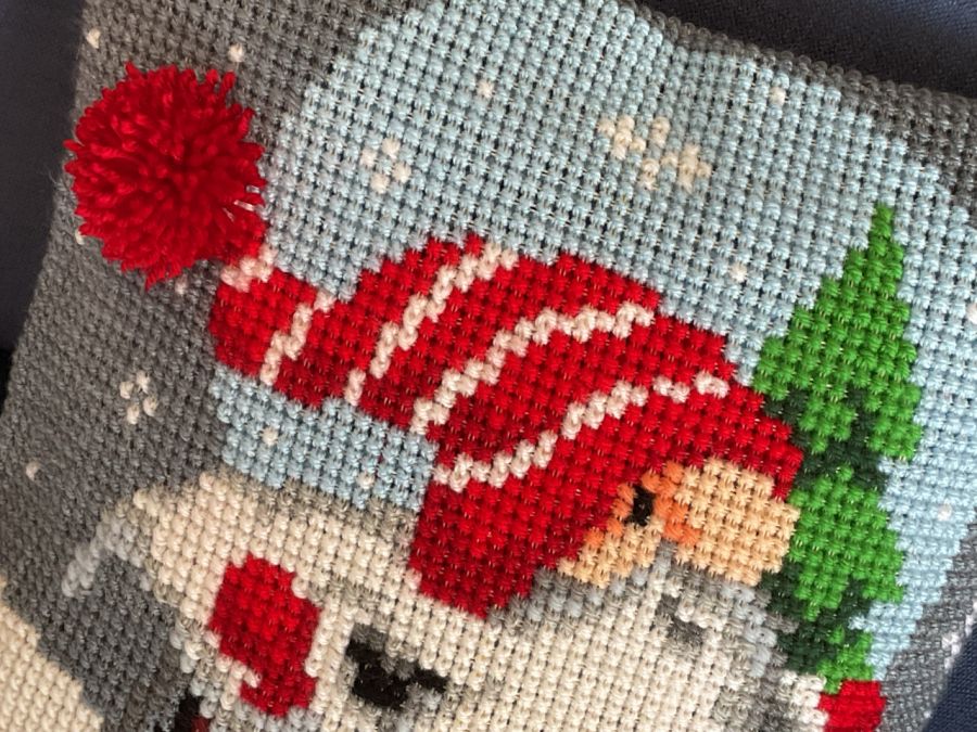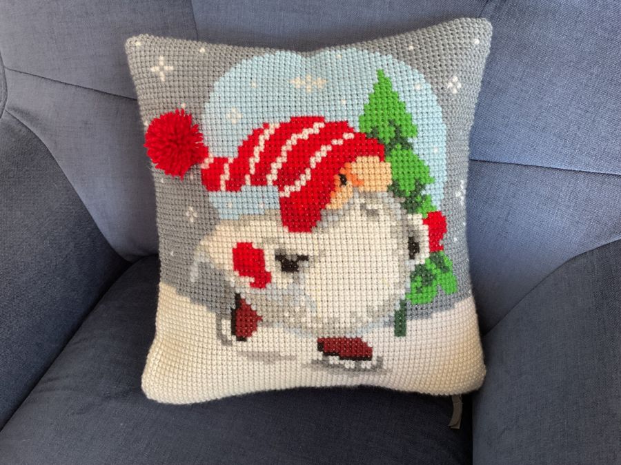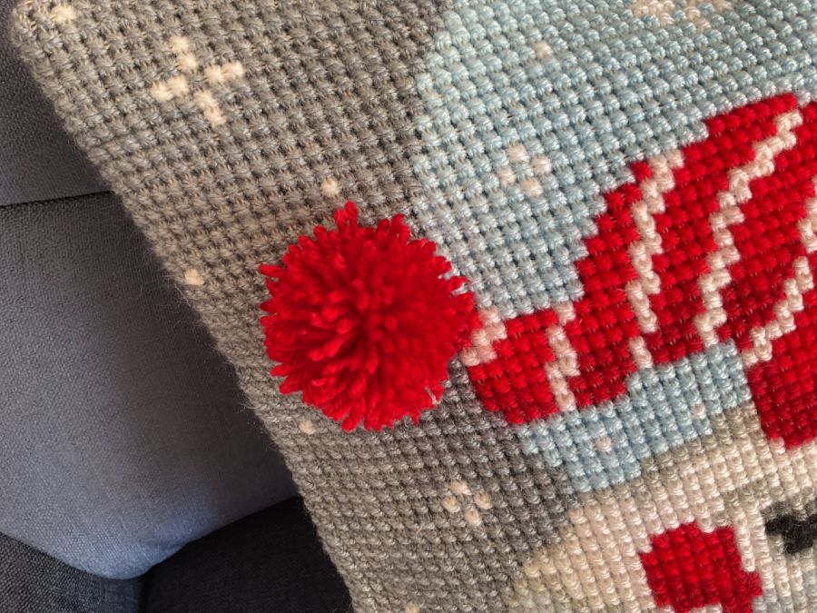Poduszka o wymiarach 40 x 40 cm wyszyta krzyżykami na kanwie poduszkowej delikatną wełną.