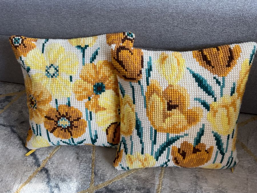Poduszka o wymiarach 40 x 40 cm wyszyta krzyżykami na kanwie poduszkowej delikatną wełną akrylową.
