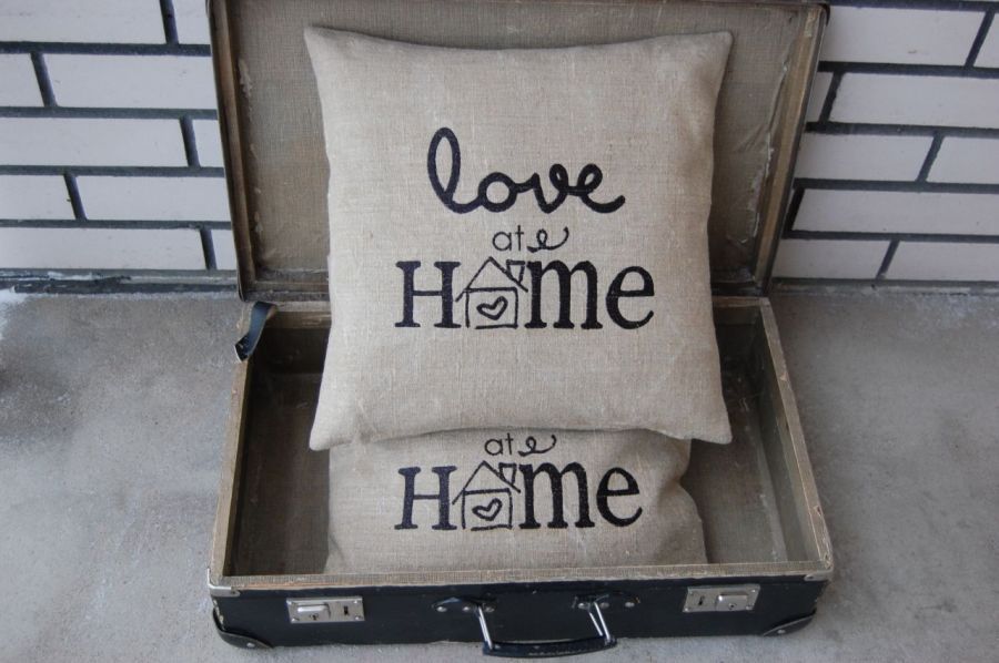 Poduszki "Love at home" - poszewki na poduszki z grubego, jutowego lnu, zapinane na zamek błyskawiczny. Ozdobione czarną grafiką/napisem "Love at home" wykonaną haftem maszynowym. Wymiary: około 40cm x 40cm. Oferta obejmuje same poszewki, bez wypełnienia. Poszewki można prać w temperaturze 40'.