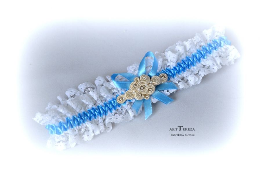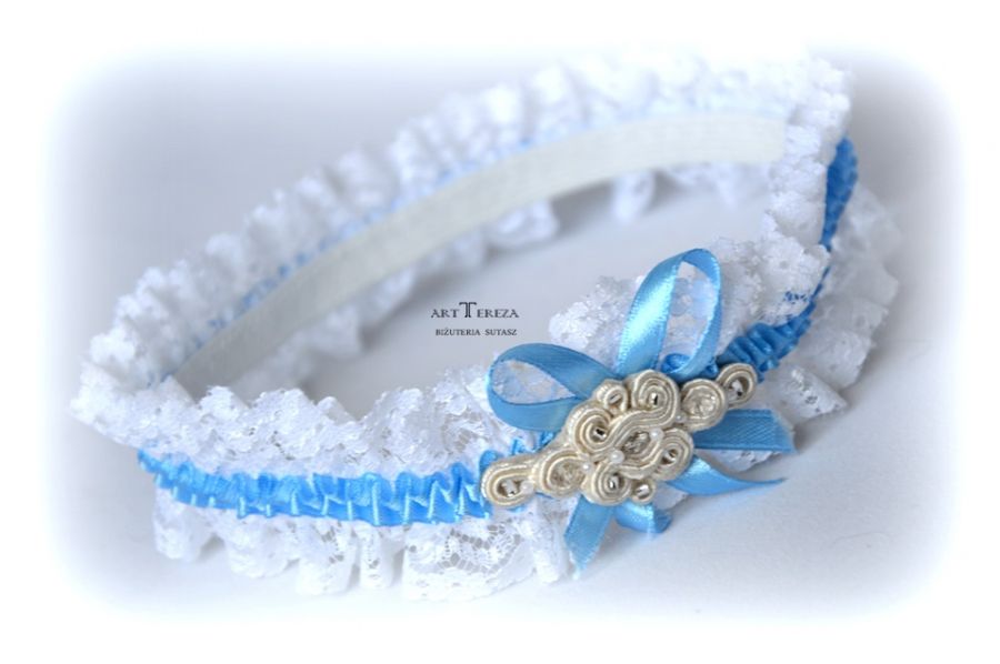 Śnieżnobiało - niebieska podwiązka ślubna z motywem sutaszu. Staranne wykonanie i wykończenie. Sutasz wypełniony koralikami kryształkami,obustronnie zaimpregnowany. Podwiązka bardzo śliczna, jest elegancka, idealna na szczególną okazję, zaskocz ukochanego.