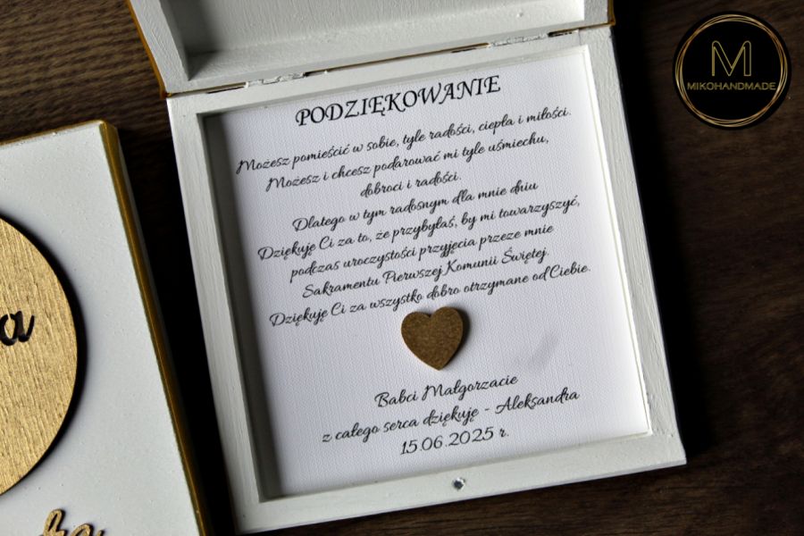 Podziękuj swoim najbliższym w wyjątkowy sposób za ich obecność, miłość i wsparcie w dniu Twojej Pierwszej Komunii Świętej. To eleganckie, ręcznie wykonane pudełko z podziękowaniem to nie tylko piękna pamiątka, ale także wyraz serca zamknięty w wyjątkowej formie.