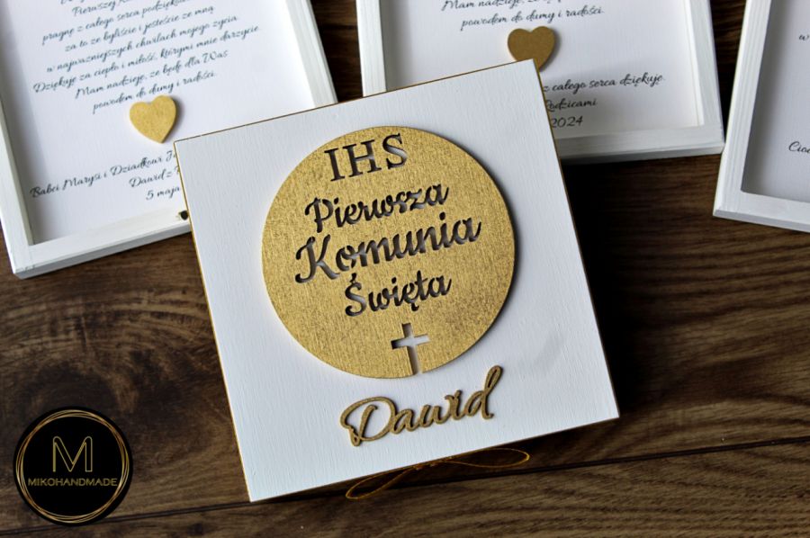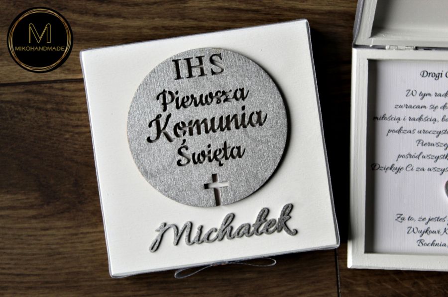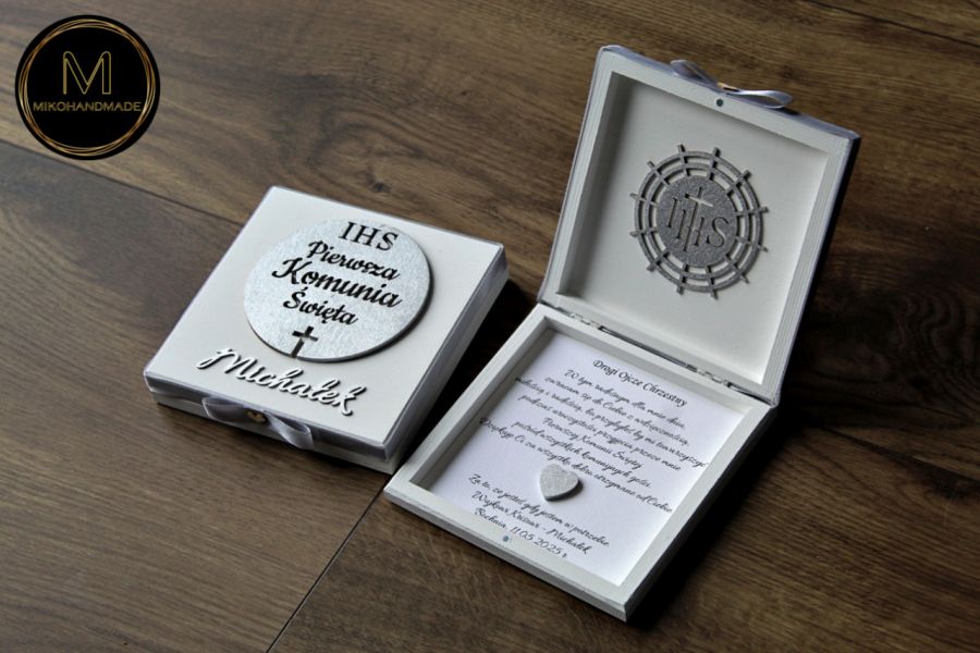 Eleganckie, drewniane pudełko w kolorze białym, stworzone z myślą o wyjątkowym podziękowaniu dla Ojca Chrzestnego z okazji Pierwszej Komunii Świętej. To nie tylko praktyczny upominek, ale przede wszystkim piękna pamiątka pełna osobistych słów i wzruszających emocji.