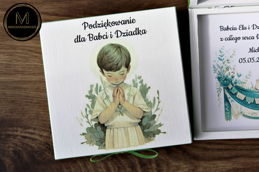 Wyjątkowy upominek, który na długo pozostanie w pamięci najbliższych! To piękne, drewniane pudełko zostało ręcznie pomalowane na biało i delikatnie ozdobione wzorem z chłopcem komunijnym oraz okolicznościowym napisem. Idealnie sprawdzi się jako oryginalne podziękowanie dla Rodziców Chrzestnych lub Dziadków z okazji Pierwszej Komunii Świętej.